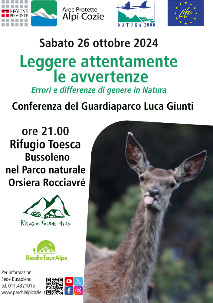 As part of the Alcotra BiodivTourAlps project, on Saturday, October 26 at 9 pm at the Rifugio Toesca, in the Orsiera Rocciavrè Park, a conference by park ranger Luca Giunti "Read the warnings carefully. Errors and gender differences in nature".