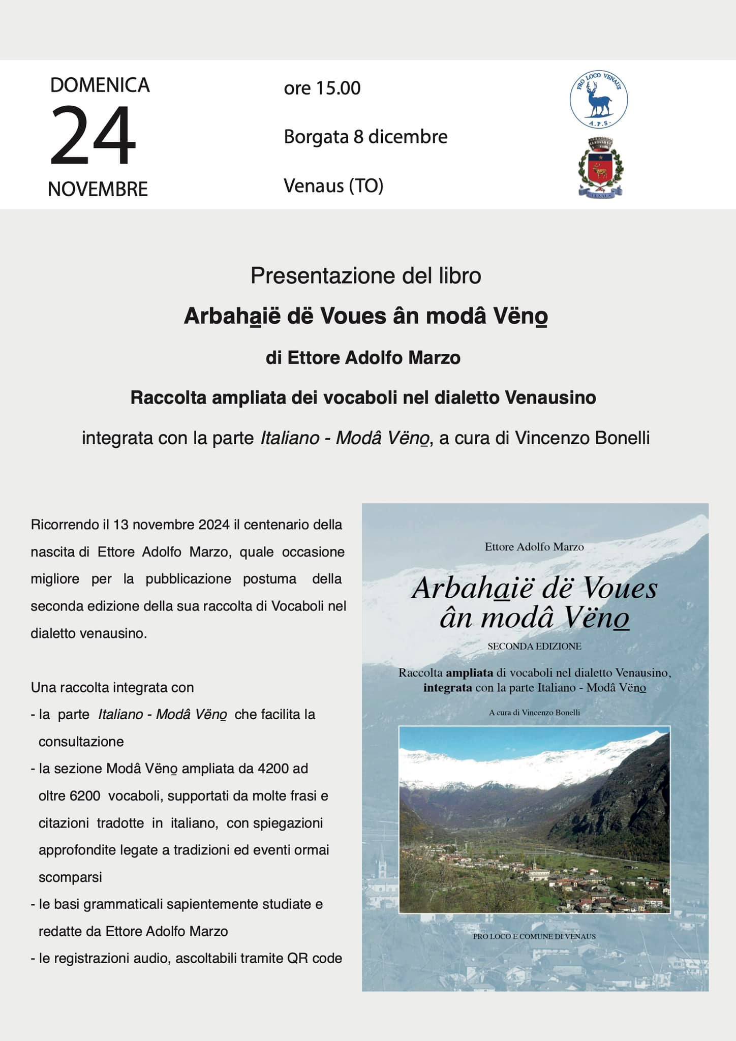 Sunday, November 24 at 03:00 pm at the multipurpose center presentation of the book "Arbahaië dë Voues ân modâ Vëno" by Ettore Adolfo Marzo.