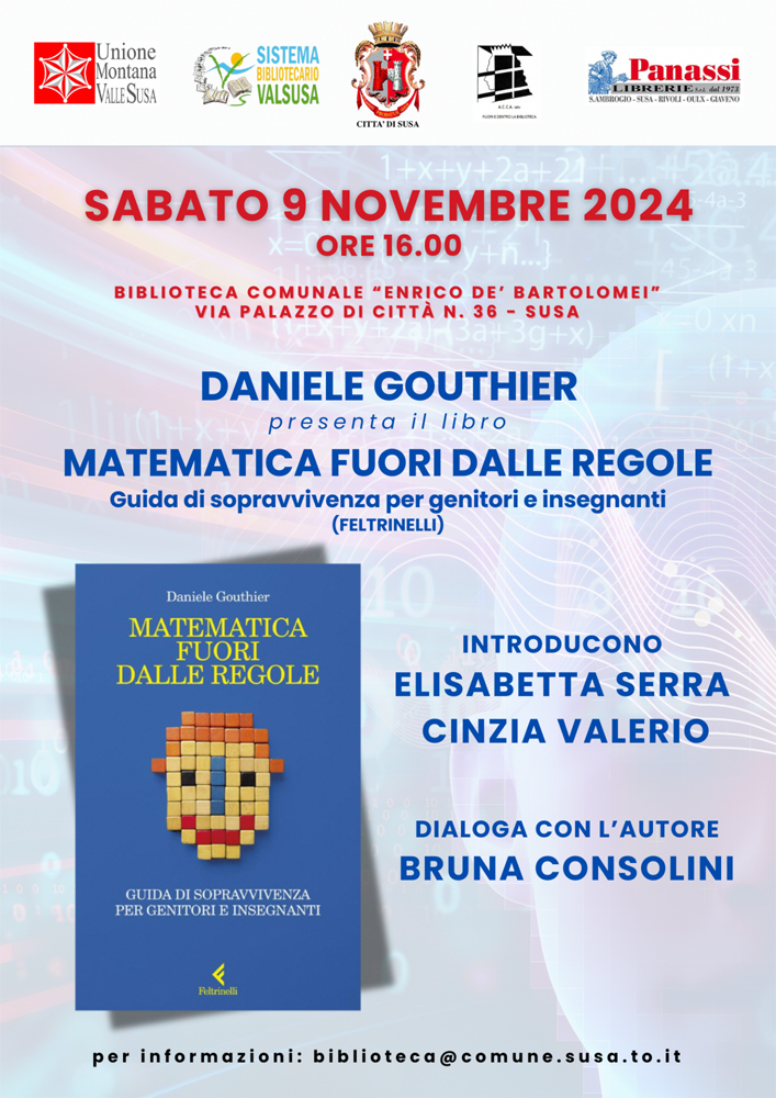 Saturday, November 9 at 04:00 pm at "Enrico De' Bartolomei" city library presentation of the book "Math Outside the Rules: A Survival Guide for Parents and Teachers" by Daniele Gouthier.