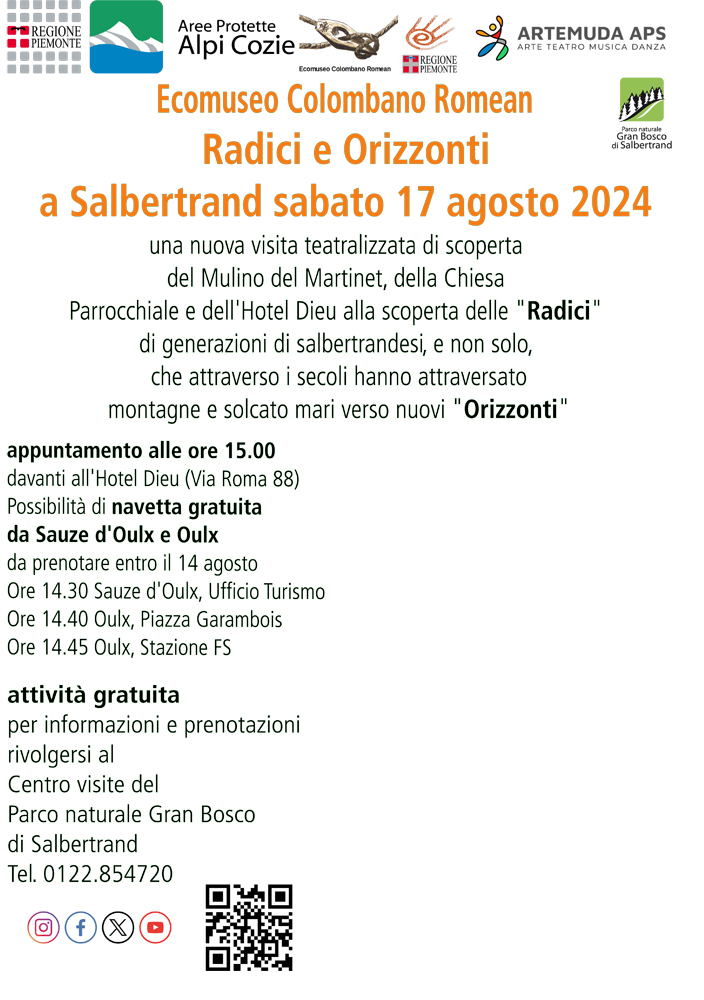 A journey through some sites of the Ecomuseum Colombano Romean: Mulino del Martinet, Parish Church of San Giovanni Battista and Hotel Dieu, to discover the "Roots" of generations of Salbertrandesi, and not only, who over the centuries have crossed mountains and sailed seas towards new "Horizons".