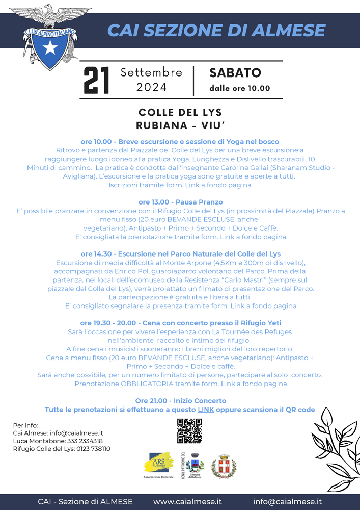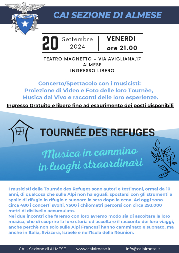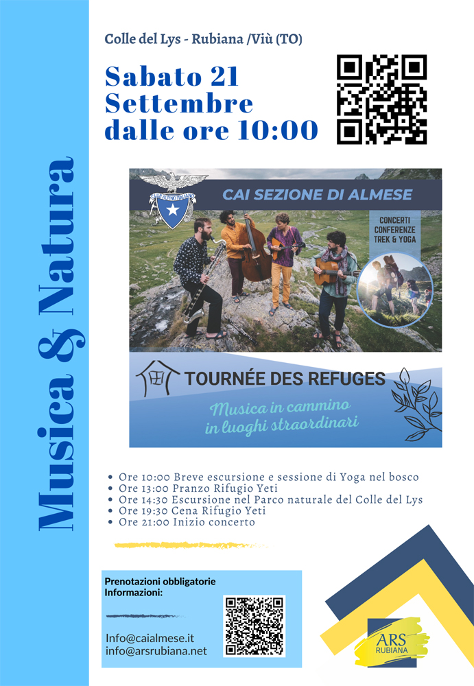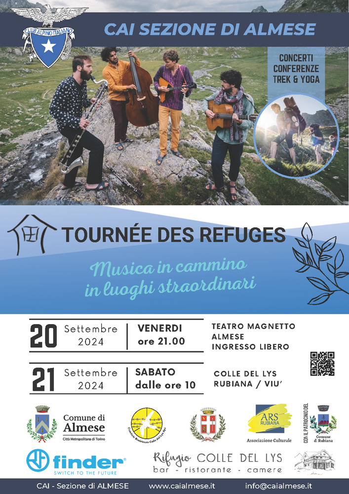An unprecedented musical initiative that will take place over 2 days with a first concert on Friday 20/09 at the Magnetto theatre in Almese at 9:00 pm and a dinner with concert on Saturday 21/09 at the Colle del Lys refuge starting at 7:30 pm.
