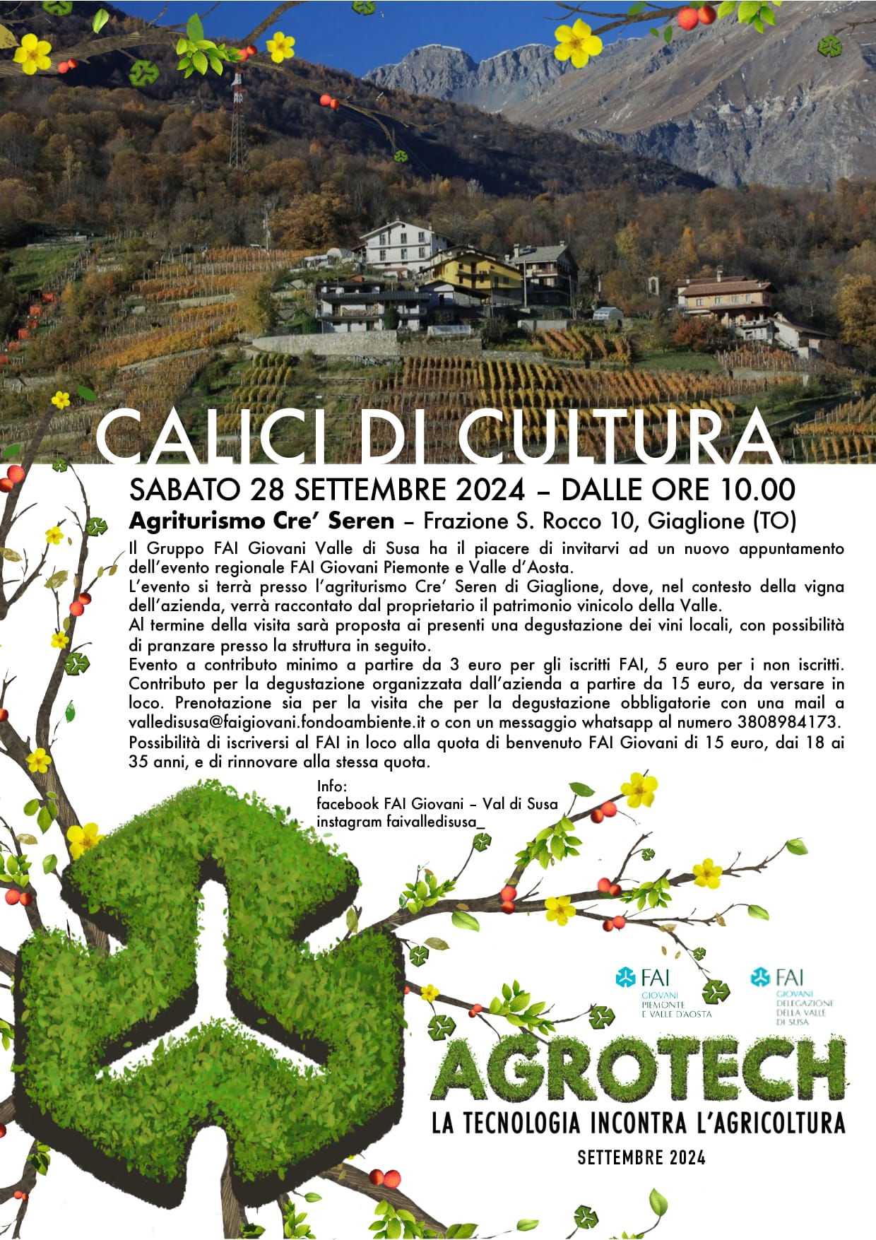 Nel fine settimana tornerà l'evento regionale “Agrotech – La tecnologia incontra l'agricoltura”, organizzato dai Gruppi Fai Giovani di Piemonte e Valle d'Aosta. Quello della Valle di Susa, guidato da Federico Olivero Pistoletto, per sabato 28 settembre organizza l'evento “Calici di cultura” che si terrà all’agriturismo Crè Seren di Giaglione, in frazione S. Rocco 10. Qui, a partire dalle 10, nel contesto della vigna dell’azienda verrà raccontato dal proprietario Giancarlo Martina il patrimonio vinicolo della Valle. Al termine della visita sarà proposta ai presenti una degustazione di vini locali, con la possibilità in seguito di pranzare nella struttura. L'iniziativa è a contributo minimo a partire da 3 euro per gli iscritti Fai, da 5 euro per i non iscritti. Il contributo per la degustazione organizzata dall’azienda è a partire da 15 euro, da versare in loco. La prenotazione sia per la visita sia per la degustazione sono obbligatorie inviando una mail all'indirizzo valledisusa@faigiovani.fondoambiente.it o un messaggio whatsapp al numero 3808984173. Nel corso della mattina di sabato sarà possibile iscriversi al Fondo Ambiente Italiano alla quota di benvenuto Fai Giovani di 15 euro, per le persone di età compresa fra i 18 e i 35 anni, e di rinnovare alla stessa quota.