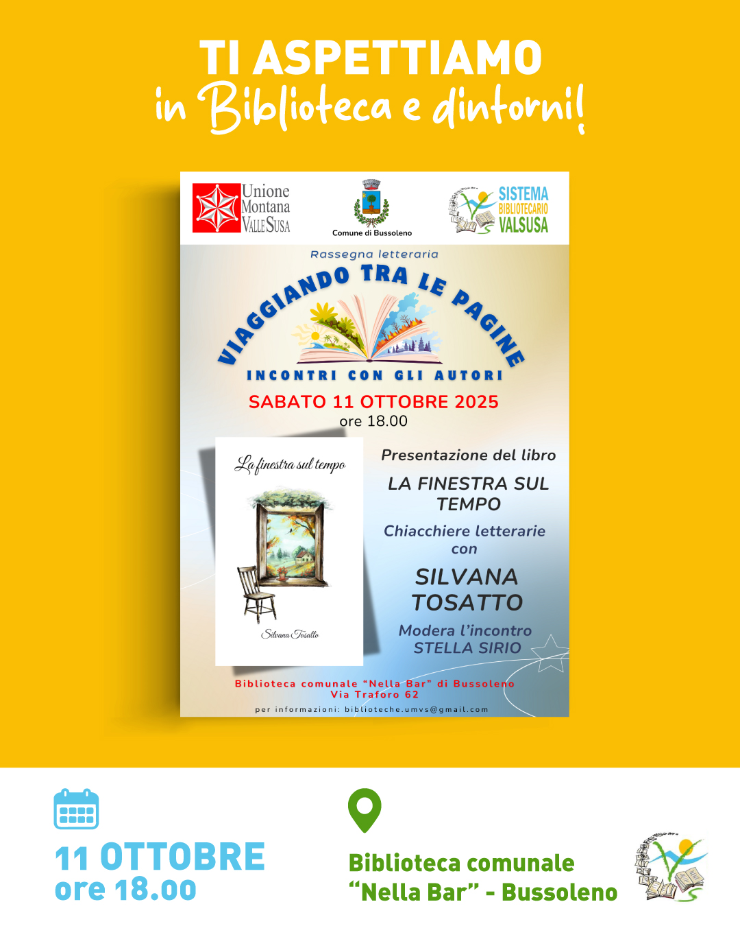 On Saturday, October 11 at 06:00 at the Nella Bar city library presentation of the book by Silvana Tosatto "La finestra sul tempo".