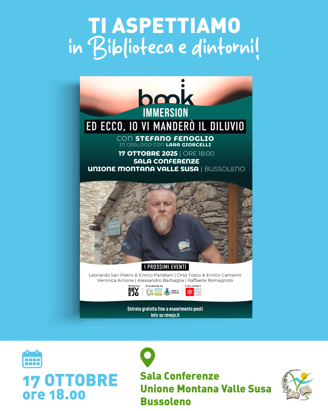 • October 17 at 06:00 pm at the Unione Montana Valle Susa conference hall in Bussoleno: Stefano Feroglio “Ed ecco, io vi manderò il diluvio” with Lara Giorelli.