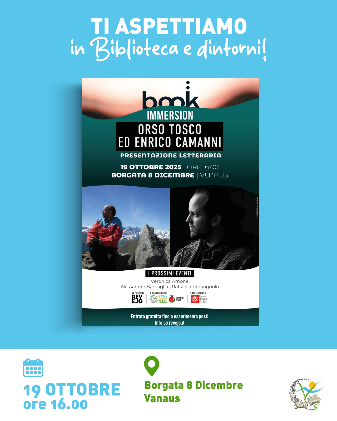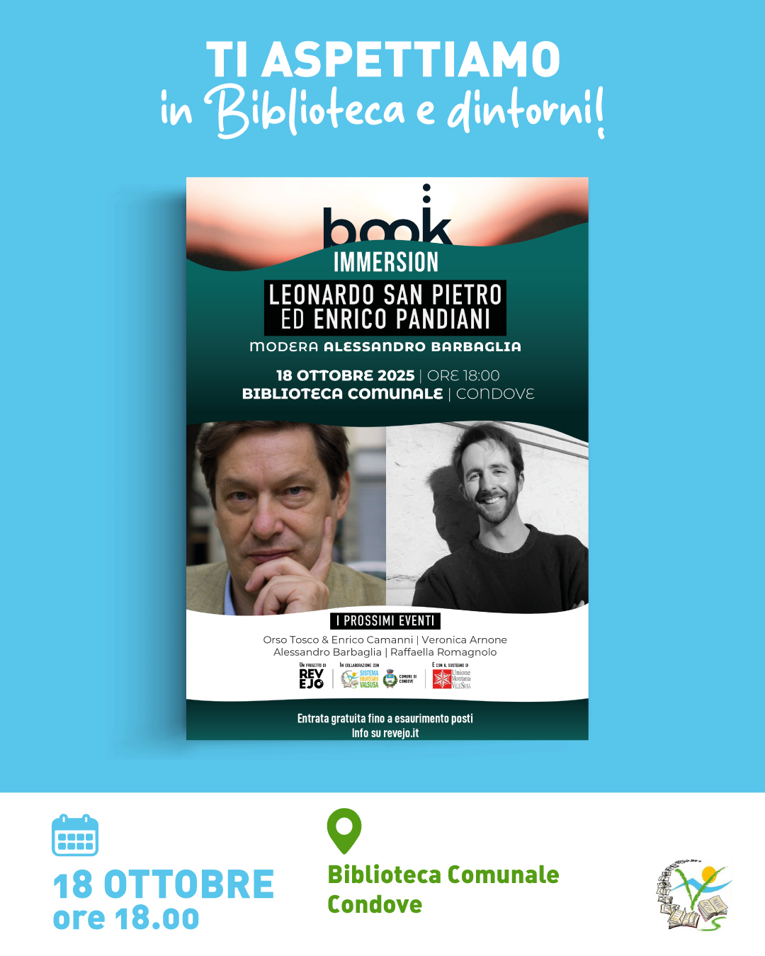 • October 18 at 06:00 pm at the city library in Condove Leonardo San Pietro and Enrico Pandiani – meeting with Alessandro Barbaglia.