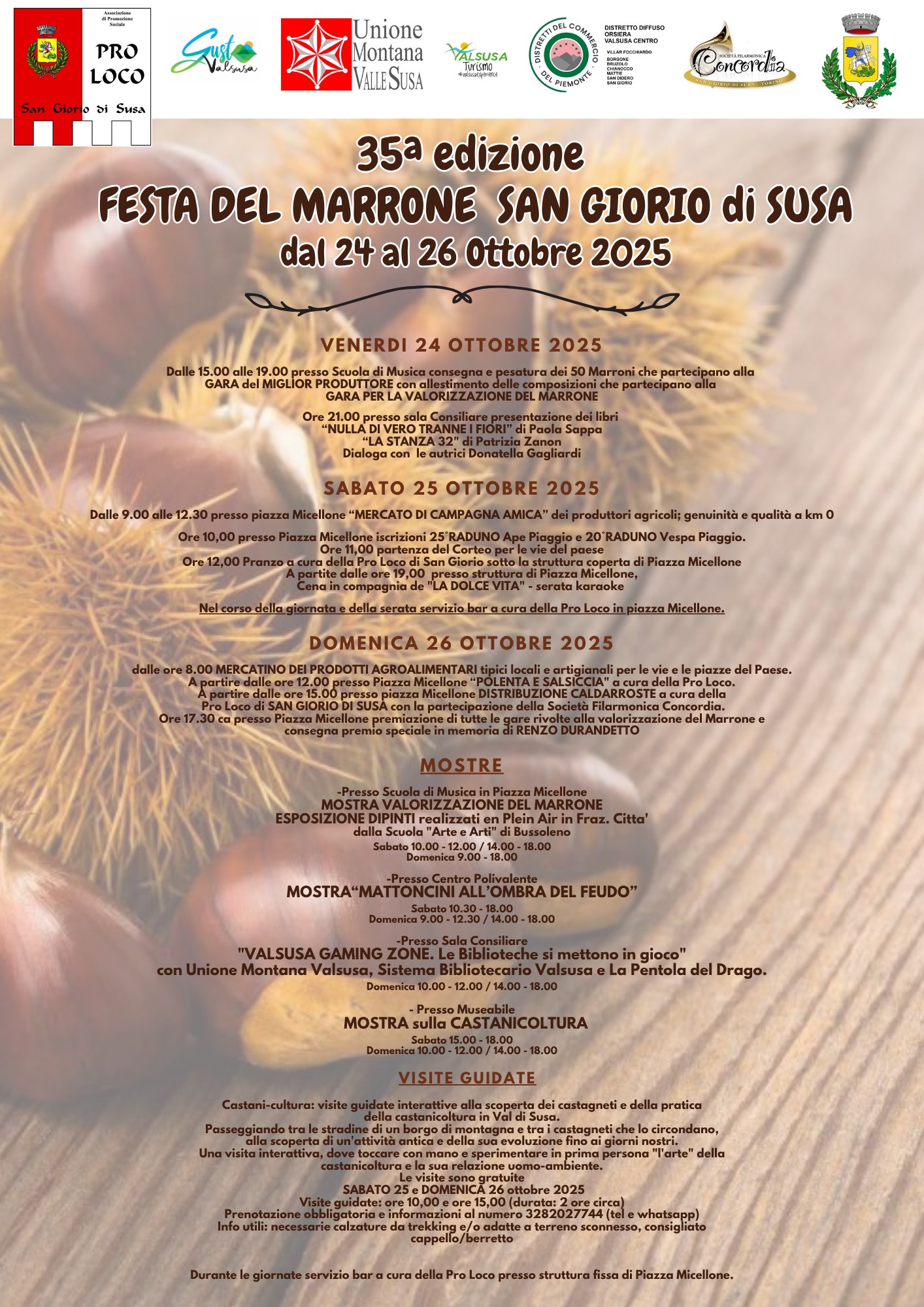 One of the most anticipated autumn events in the Susa Valley returns: the San Giorio di Susa Chestnut Festival, now in its 35th year. Three days dedicated to the flavors, traditions, and culture of the area, with a rich program of events including tastings, exhibitions, guided tours, and entertainment for all ages.