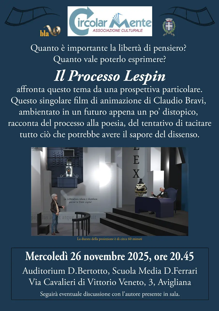 At the Daniele Bertotto auditorium on Wednesday, November 26 at 08:45 pm screening of the "The Lespin Trial" movie.