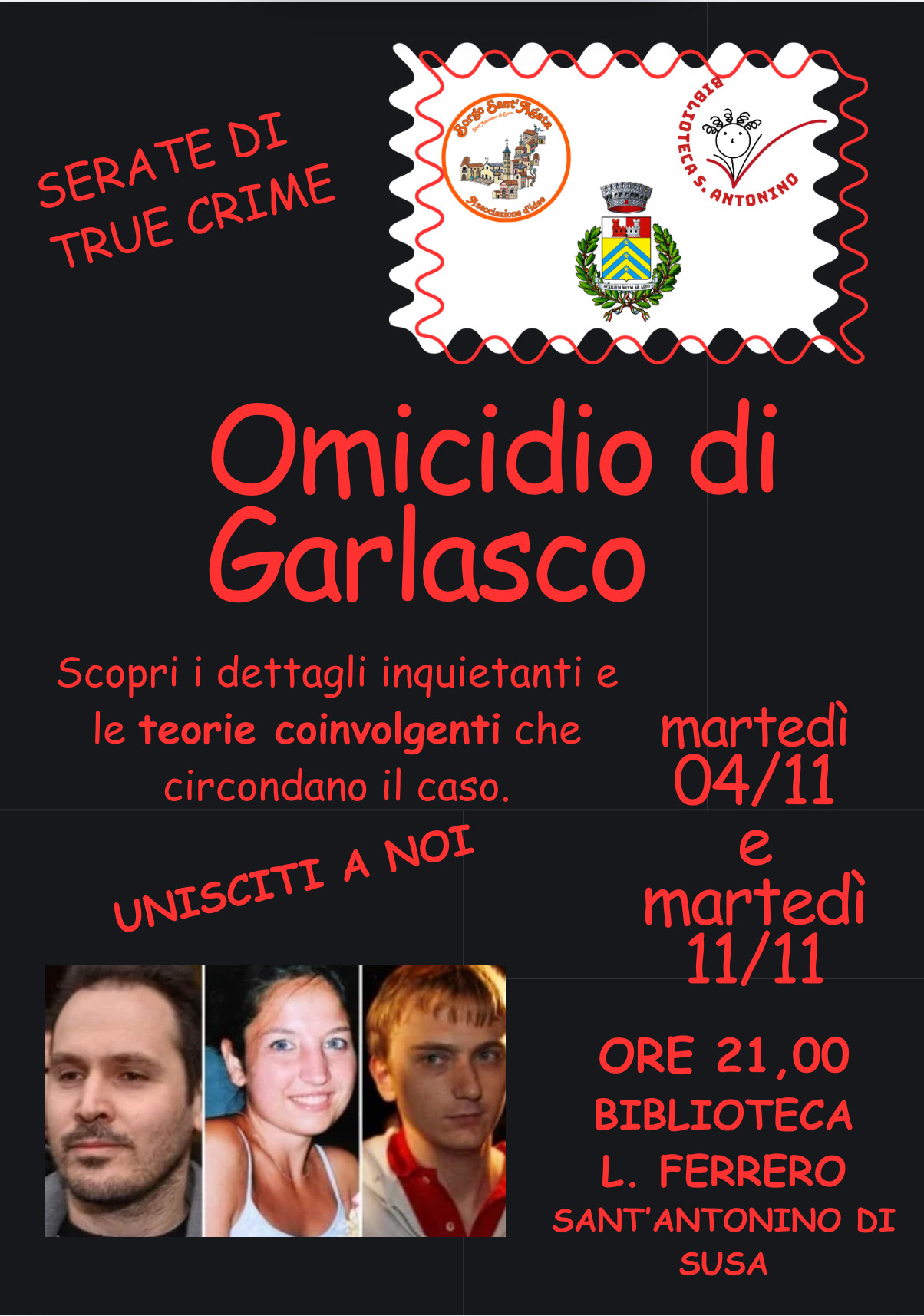 Two meetings on November 4 and 11 at 09:00 pm at the "L. Ferrero" city library in Sant’Antonino di Susa about the Garlasco homicide.