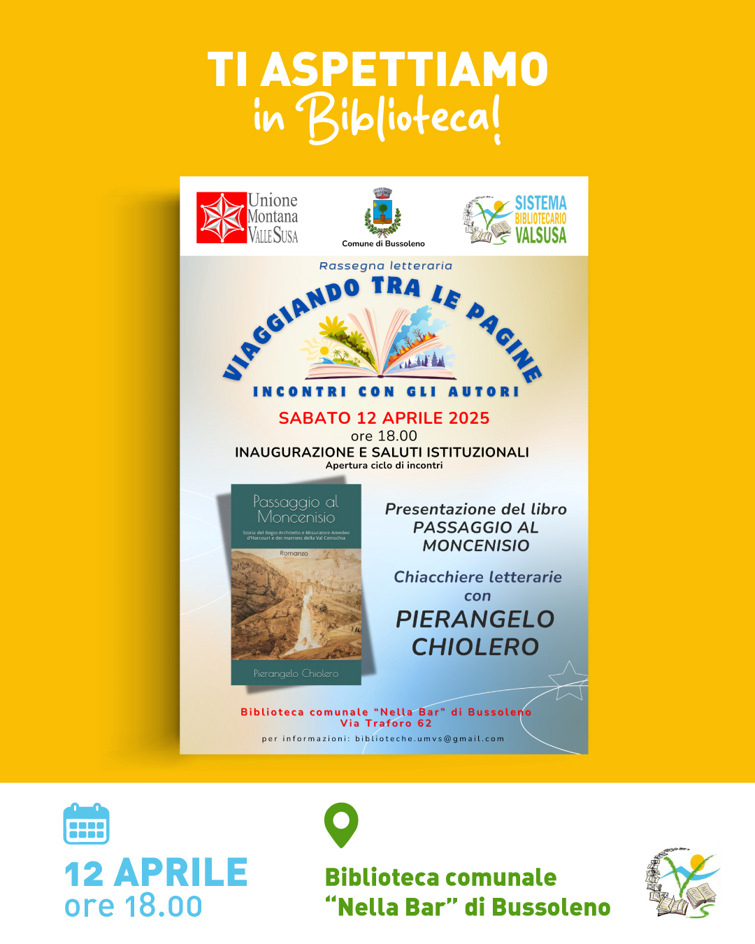 On Saturday, April 12 at 06:00 pm at the Nella Bar city library presentation of the book by Pierangelo Chiolero "Passaggio al Moncenisio".