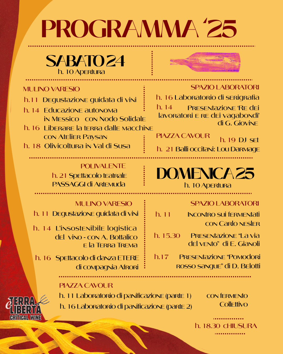 Food and wine and cultural festival dedicated to wine, the fruit of the work of “resistance” producers. During the event, the streets of Bussoleno fill with wine, winemakers, producers, meetings, book presentations, music and Occitan dances.