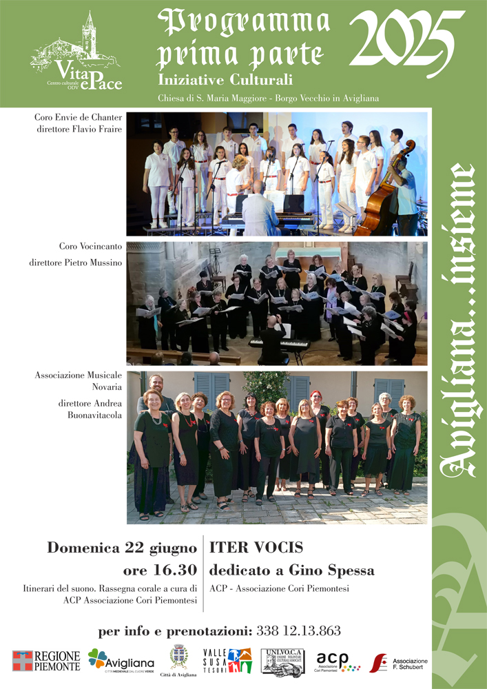 On Sunday, June 22 at 04:30 pm at the church of Santa Maria Maggiore in Avigliana three appreciated choral groups of the territory: the ENVIE DE Chanter choir, directed by Flavio Fraire; the Vocincanto Choir, directed by Pietro Mussino; the NOVARIA Musical Association, directed by Andrea Buonavitacola.