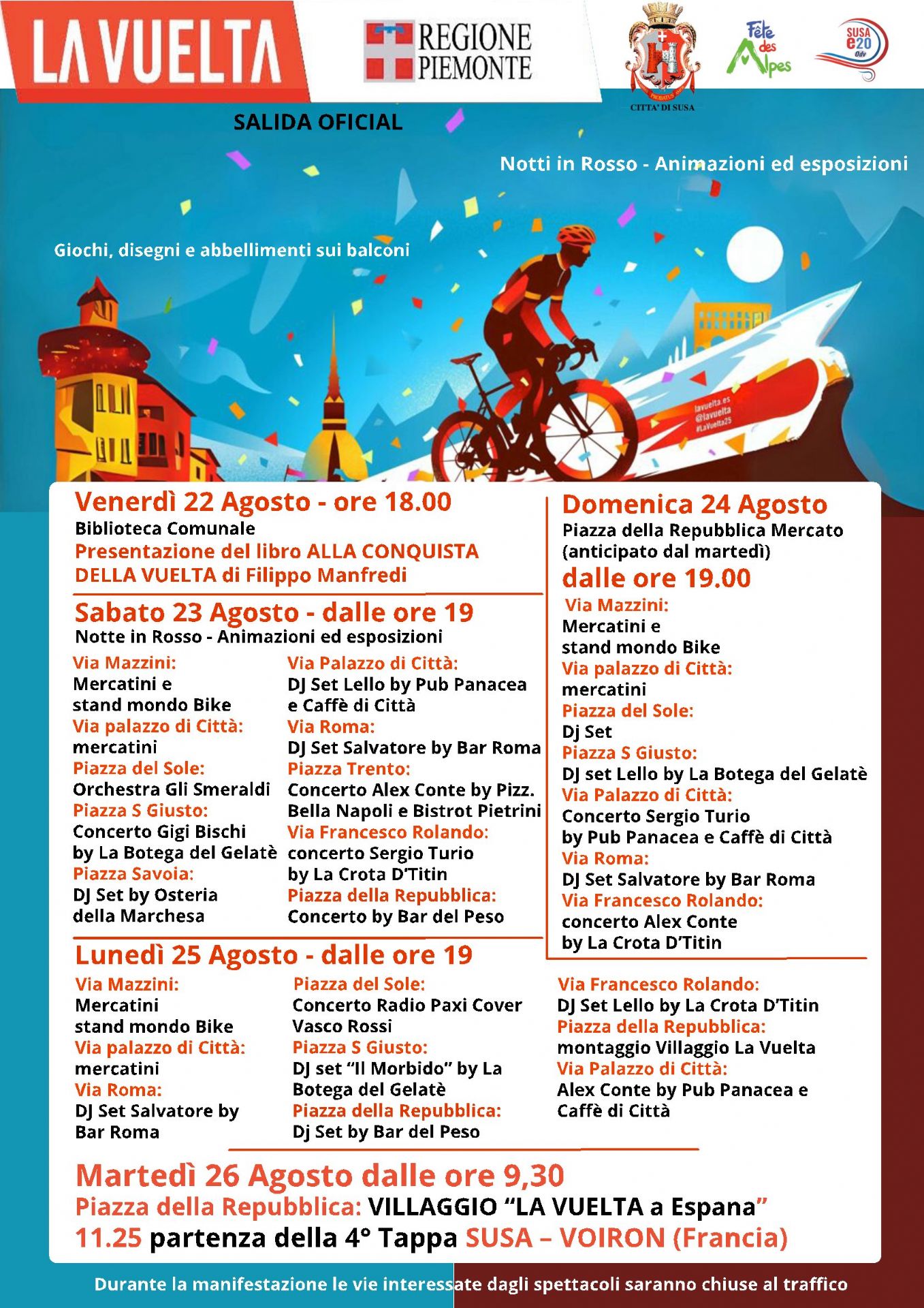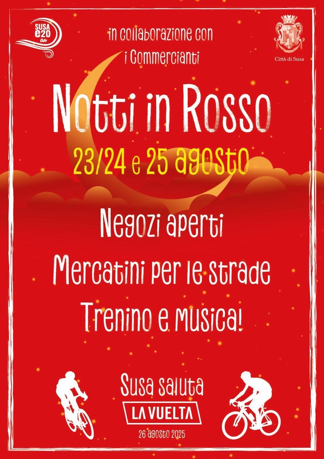 For the occasion, the city of Susa will host "Notti in Rosso," three days of music, entertainment, and fun with open shops, street markets, and a mini train that will inaugurate the event. On August 26th, cyclists can expect the start in the Vuelta village, where there will also be a stand from the Unione Montana Valle Susa.