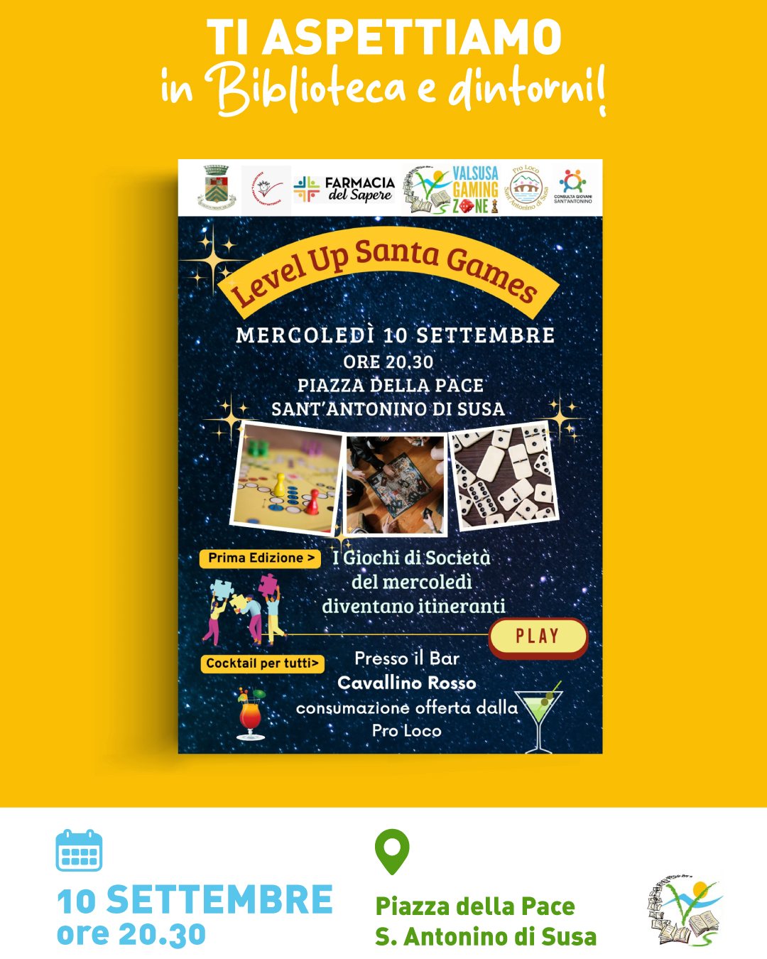 On Wednesday, September 10 at 08:30 pm at piazza della Pace in Sant'Antonino di Susa a special evening dedicated to traveling board games.