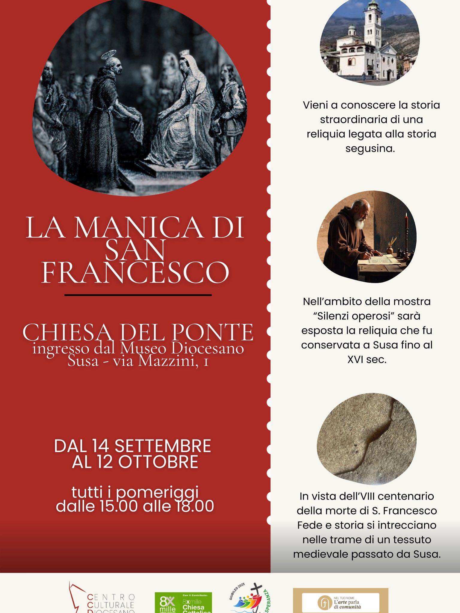 As part of the exhibition, from September 14 to October 12, the Sleeve of Saint Francis of Assisi will be on display in the Chiesa del Ponte—a remarkable relic that links the history of the Saint to that of the city of Susa.