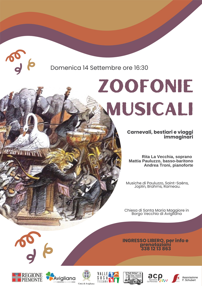 At 4:30 PM on September 14th, as part of the 2025 series at the Church of Santa Maria Maggiore in the old town of Avigliana, the concert "Zoofonie Musicali" will take place. This performance is conceived by composer and bass-baritone Mattia Sebastiano Pauluzzo and will feature soprano Rita La Vecchia, Pauluzzo himself, and pianist Andrea Troni.