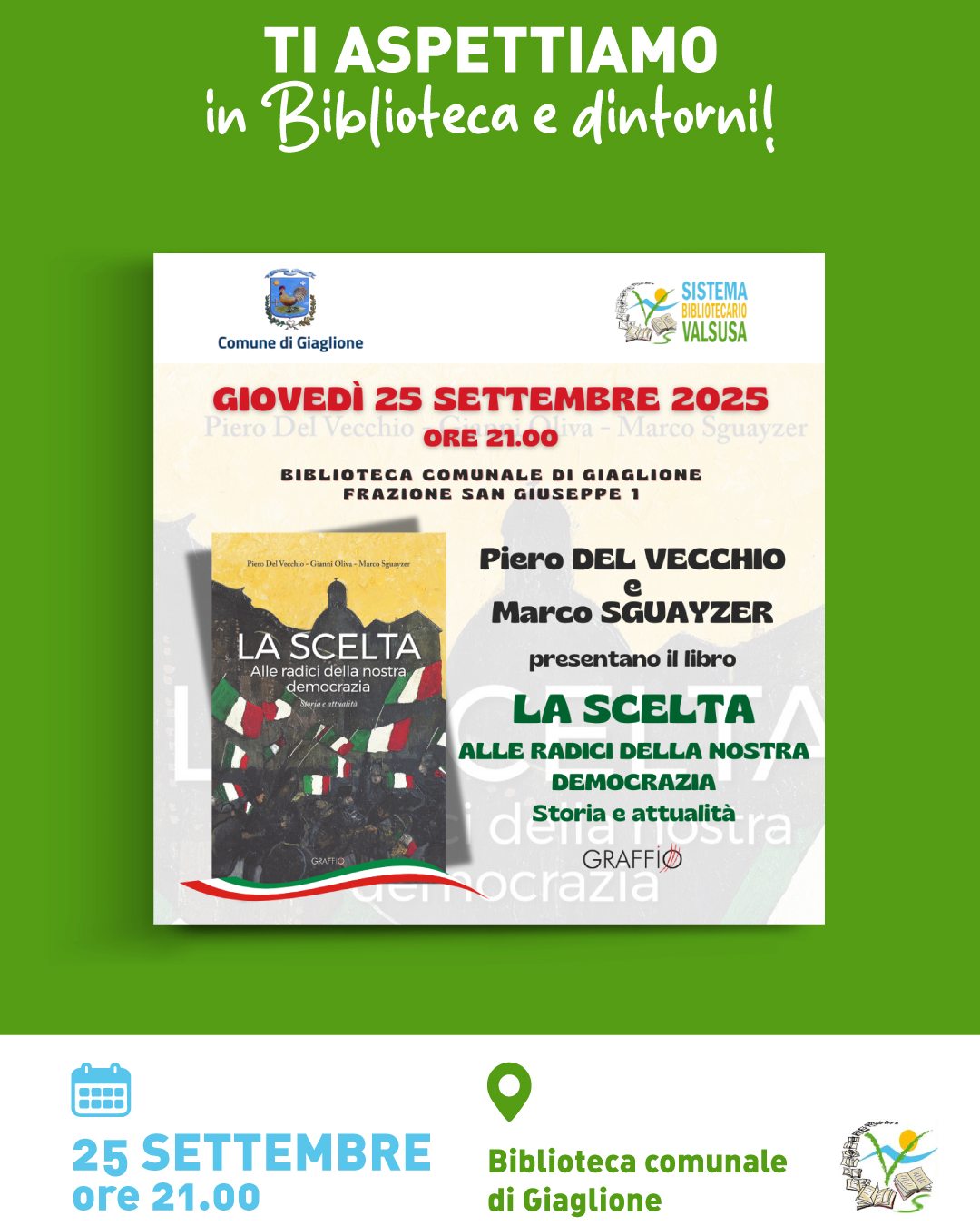 On September 25 at 09:00 pm at the City Library in Giaglione presentation of the book by Piero Del Vecchio and Marco Sguayzer "La scelta. Alle radici della nostra democrazia - Storia e attualità".