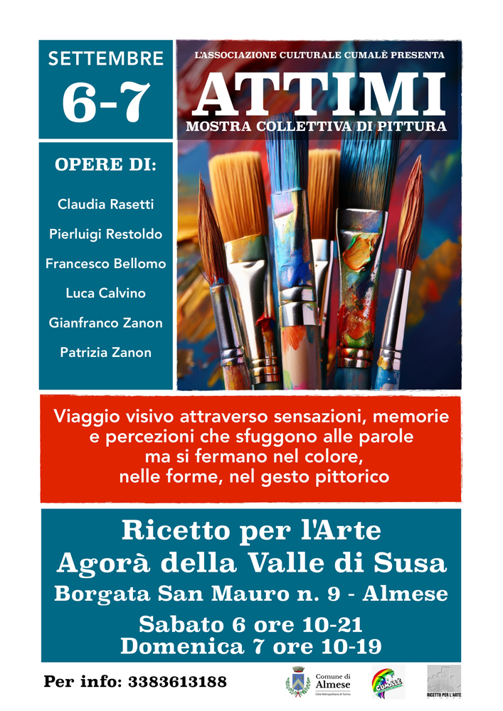 At the Ricetto per l’Arte - Agorà della Valle di Susa “ATTIMI” collective painting exhibition by Claudia Rasetti, Pierluigi Restoldo, Francesco Bellomo, Luca Calvino, Gianfranco Zanon and Patrizia Zanon.