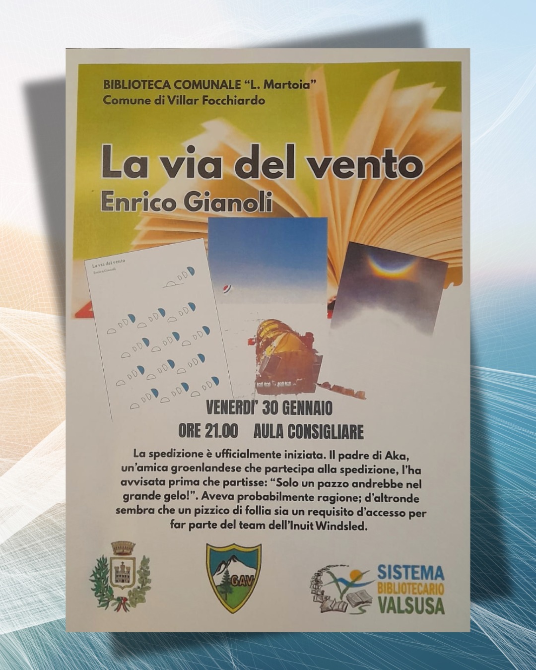 On Friday, January 30 at 09:00 pm at the council hall presentation of the book "La via del vento" by Enrico Gianoli.