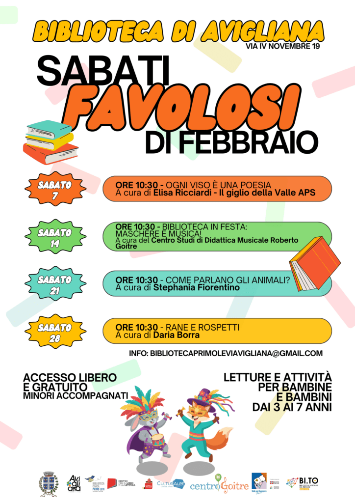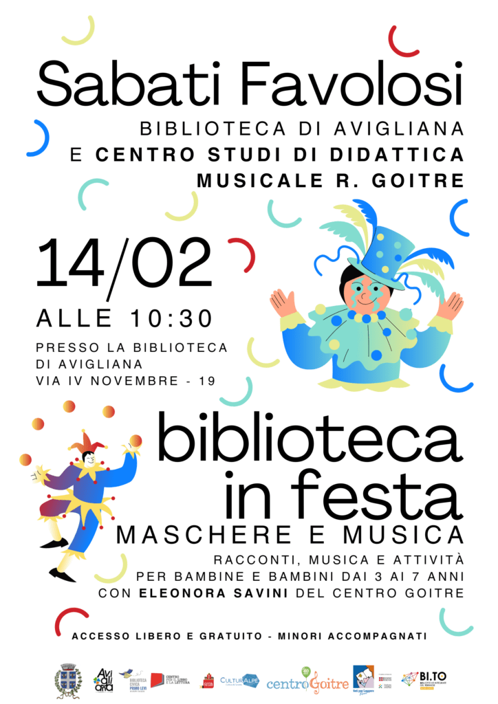 The Avigliana library is preparing to celebrate Carnival. This February, a carnival event featuring masks and music by the Roberto Goitre Music Education Study Center is scheduled for Saturday the 14th at 10:30 a.m. Eleonora Savini will entertain children aged 3 to 7. Admission to the party, as with all the monthly events, is free; minors must be accompanied.