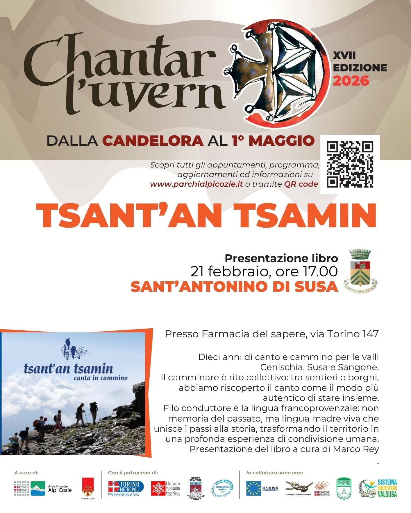Saturday, February 21, at 5:00 PM in a Sant'Antonino di Susa alla Farmacia del Sapere, Tsant'an Tsamin: A book, a project. A journey through countries, songs, and nature. A journey through the Franco-Provençal language. will host the presentation of the book celebrating 10 years of walking in the Susa Valley, edited by Marco Rey and Flavio Giacchero.