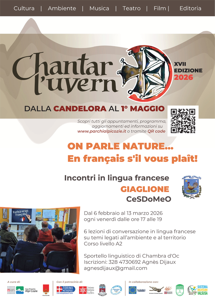 From February 6th to March 13th, every Friday from 5:00 PM to 7:00 PM, at Ce.S.Do.Me.O. (Giaglione Oral Memory Documentation Study Center) in Giaglione, San Giuseppe 1, 6 lessons to facilitate conversation in French on topics related to the environment and the local area.