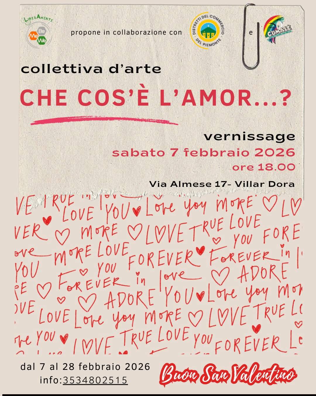 The group art exhibition "What is love...?" will take place from February 7th to 28th at the BeMeWe venue (Via Almese 17) in Villar Dora.