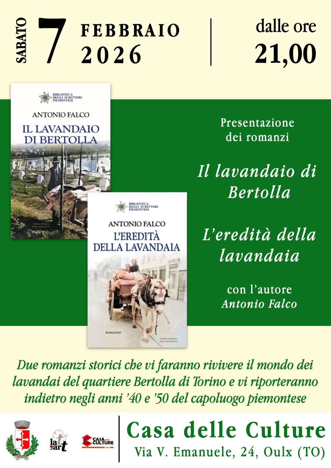 Presentation of the books by Antonio Falco "Il lavandaio Bertolla" and "L'eredità della lavandaia", at the Casa delle Culture at 09:00 pm.