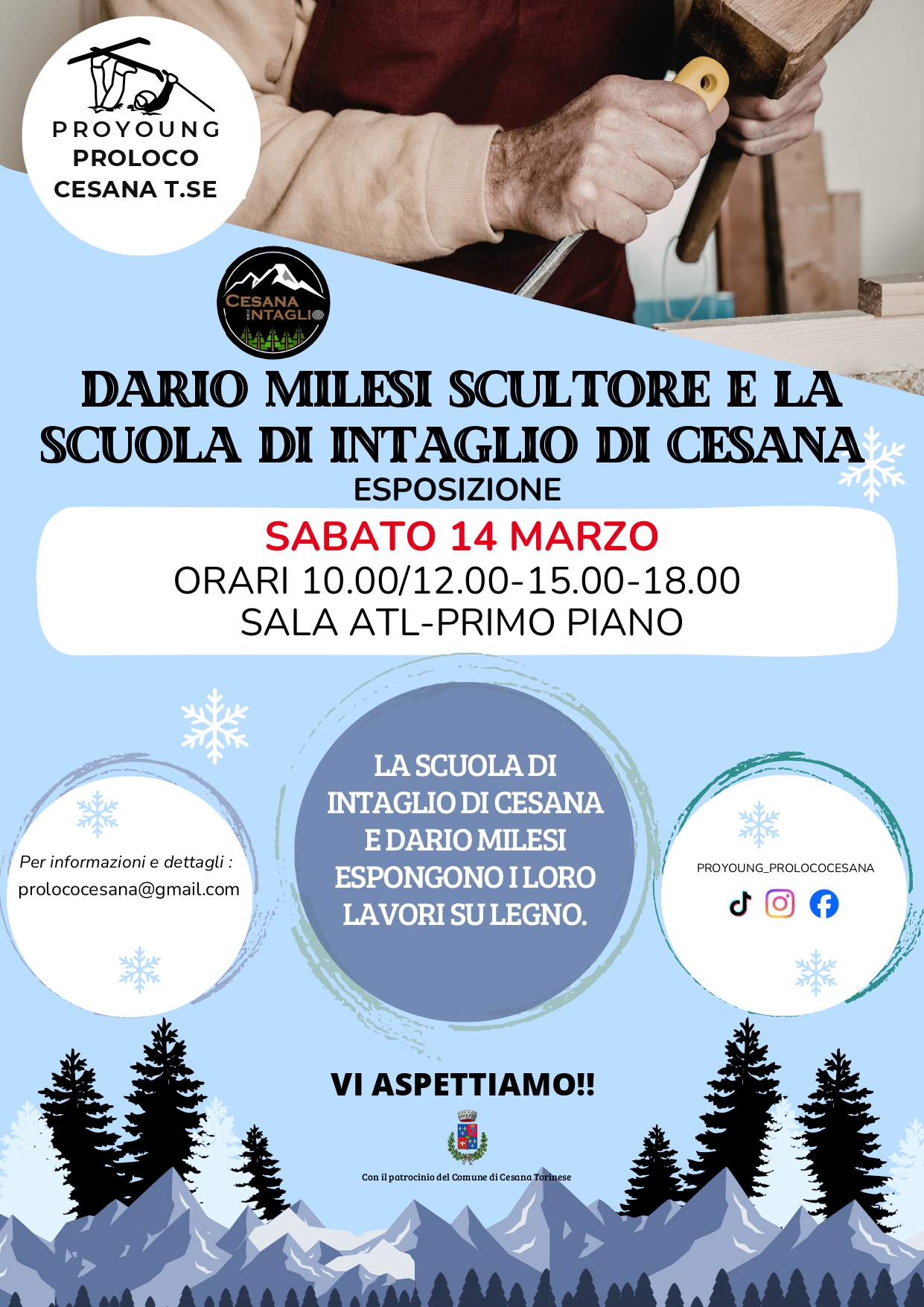 Exhibition space of the works of the sculptor Dario Milesi and the Cesana carving school from 10 am to 12 pm and from 3 pm to 6 pm in the multipurpose room on the first floor of the tourist office in Piazza Vittorio Amedeo.