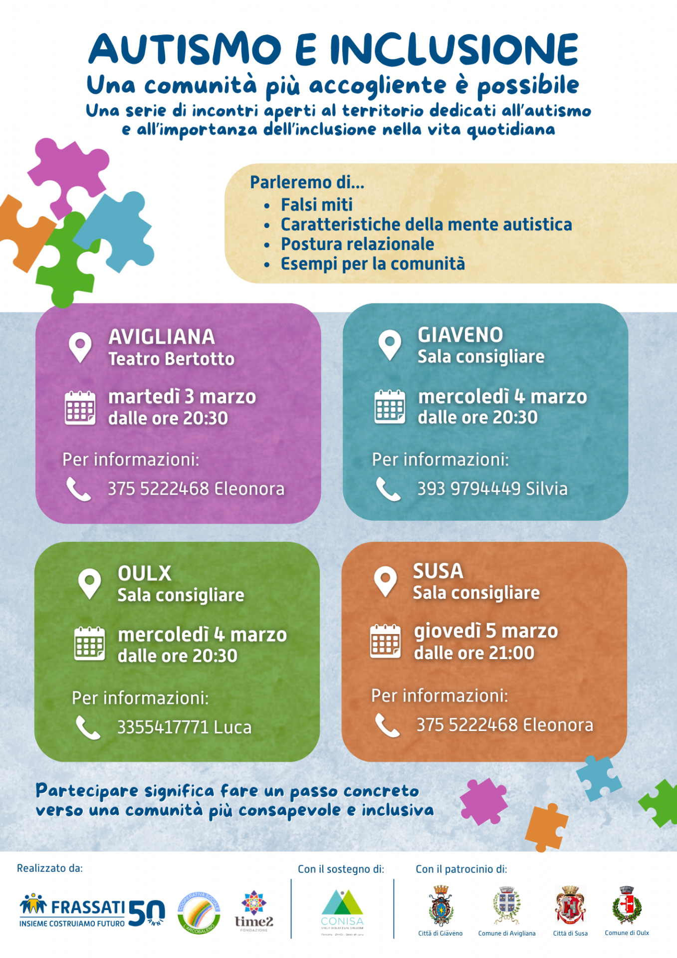 The P.G. Frassati Social Cooperative, together with the Time2 Foundation, is organizing a series of meetings open to the local community dedicated to autism and the importance of inclusion in everyday life. The meetings will address:
