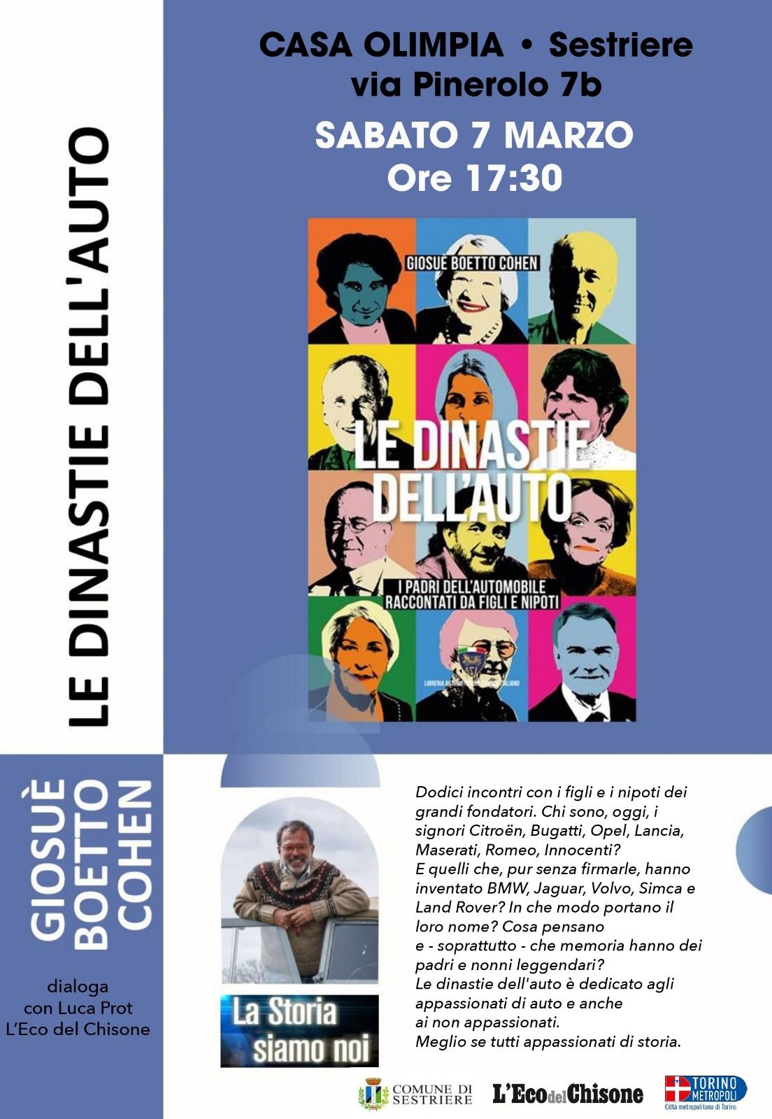 Saturday, March 7th, at 5:30 pm, Casa Olimpia Sestriere will host a presentation of the book "Le dinastie dell'auto" by Giosuè Boetto Cohen. The journalist and writer, author of international books and exhibitions, a longtime contributor to Corriere della Sera and Quattroruote, and for ten years director, author, and host of RAI's "La Storia siamo noi" and other programs, will be present.