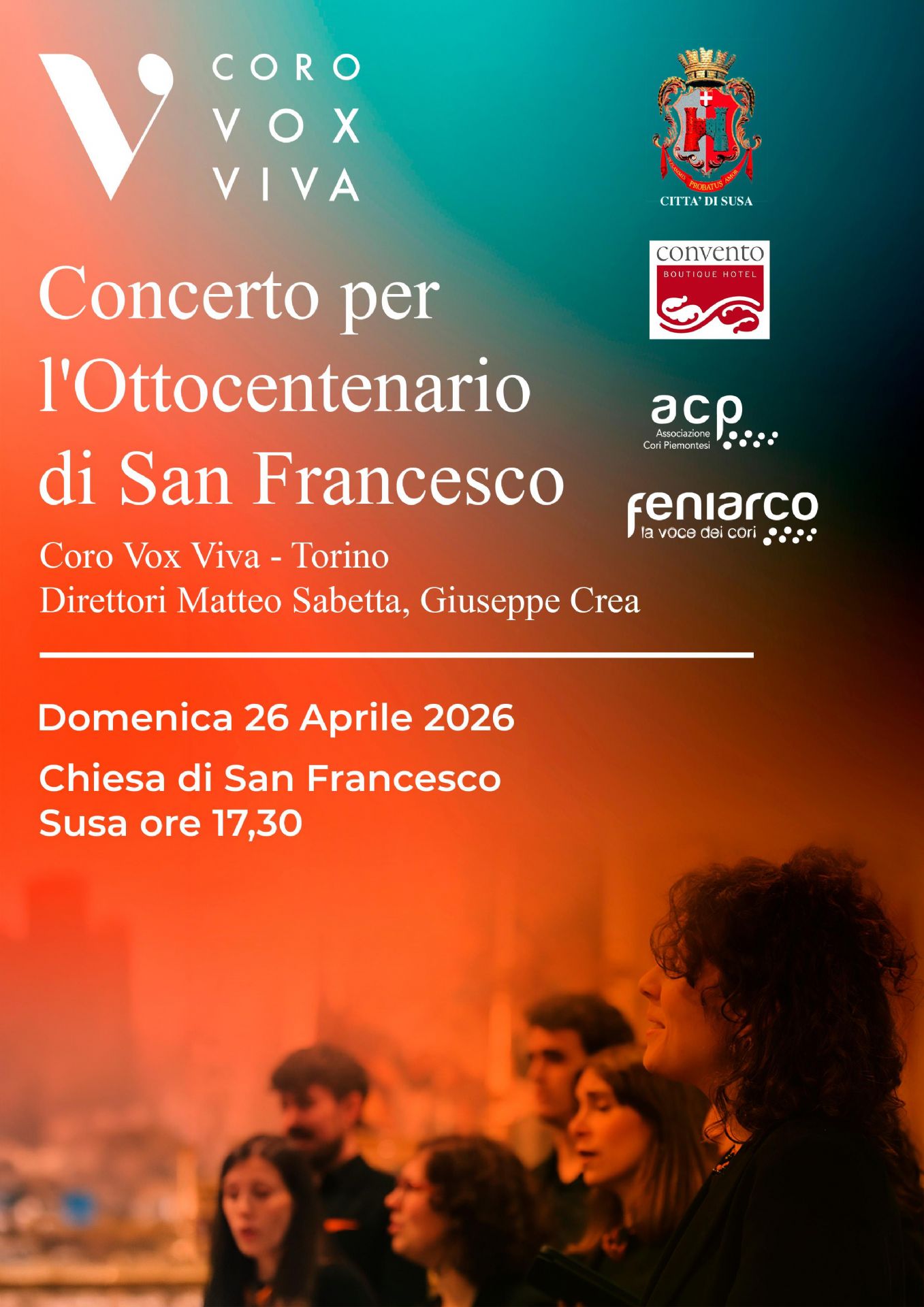 Sunday, April 26, at 5:30 p.m., in the church of San Francesco in Piazza San Francesco 3 in Susa, a concert for the 800th anniversary of Saint Francis will be held with the Vox Viva choir of Turin.