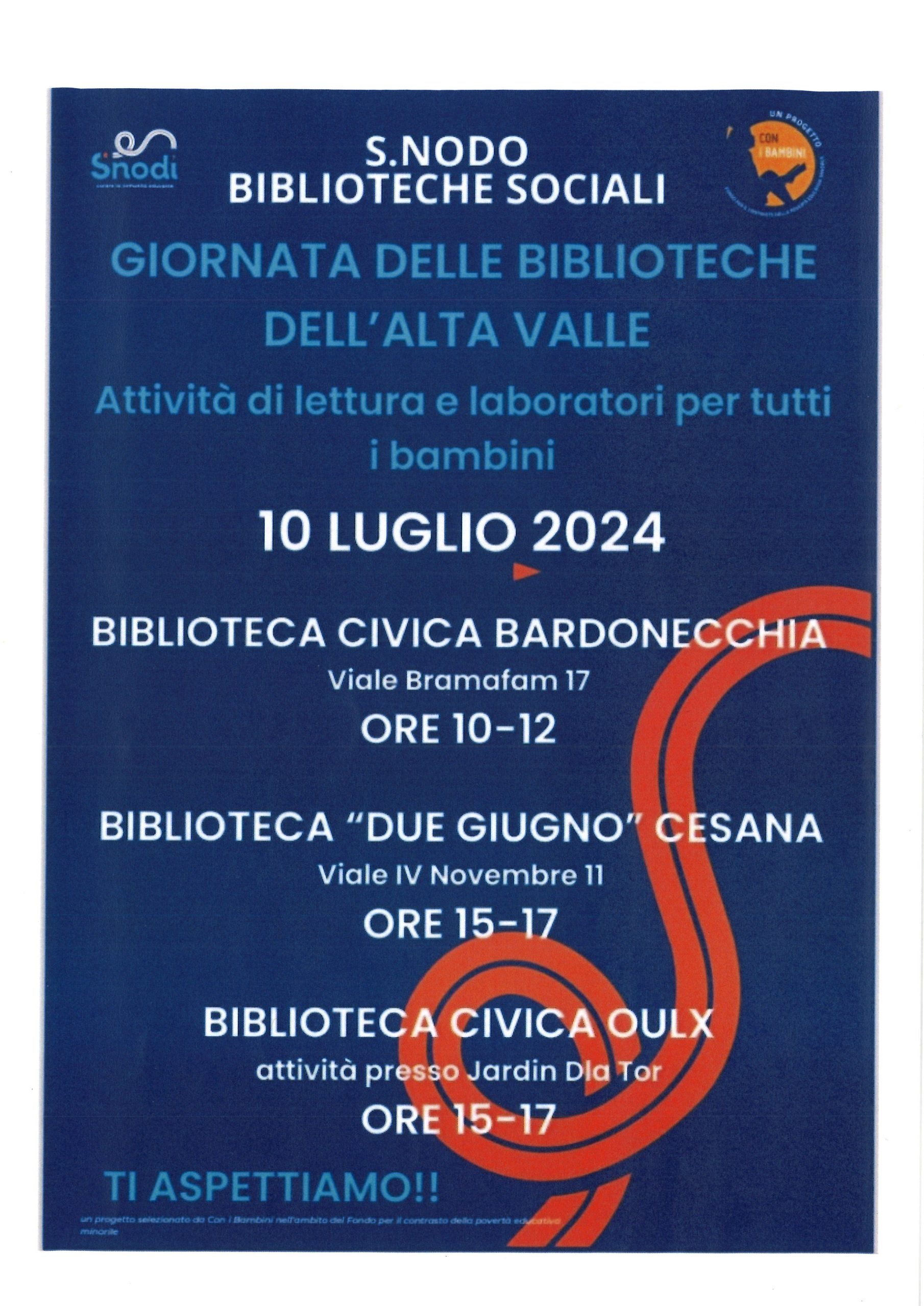 Journée des bibliothèques à Cesana Torinese (15h00-17h00), Bardonecchia (10h00-12h00) et Oulx (15h00-17h00). Des lectures et des atéliers pour tous les enfants.
