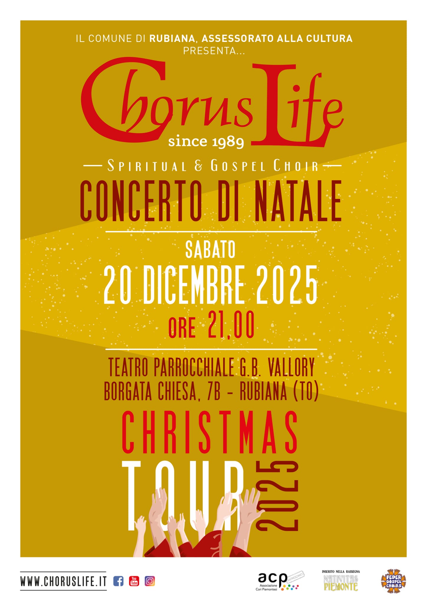 Samedi 20 dècembre à 21h00 au théâtre paroissial G.B. Vallory à Rubiana Chorus Life Spiritual Gospel Choir en concert.