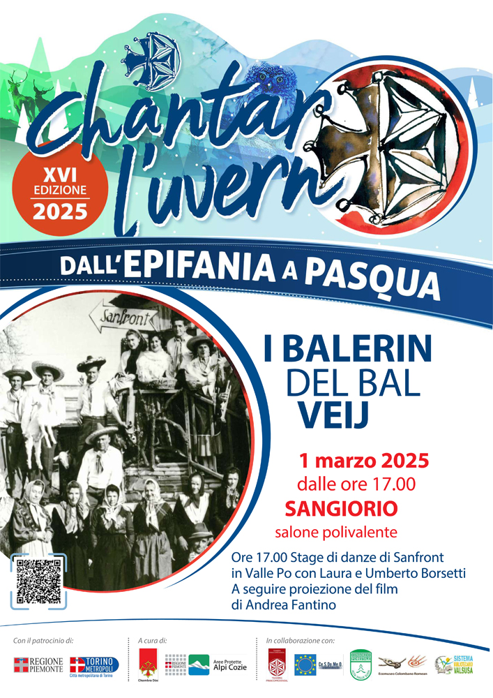 A San Giorio di Susa à 17h00 dans le salon polyvalent un cours de danse dédié aux danses du Sanfront de la vallée du Pô, avec Laura et Umberto Borsetti suivi de la projection du documentaire I Balerin Del Bal Veij par Andrea Fantino.
