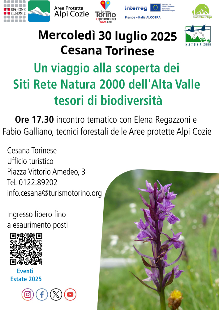 Mercredi 30 juillet à 17h30 à Cesana Torinese, office de tourisme, rencontre thématique : « Un voyage à la découverte des sites du réseau Natura 2000 de la Haute Vallée, trésors de biodiversité » avec Elena Regazzoni et Fabio Galliano.