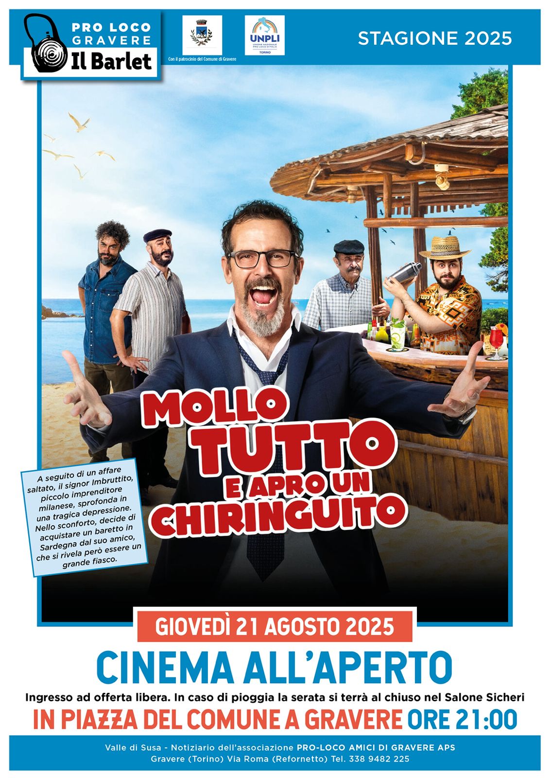 Festival de cinéma d'été en plein air à Gravere tous les jeudis à 21h sur la Piazza del Comune.