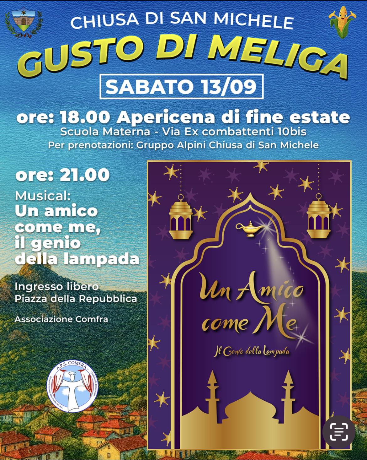 À 18h, apéritif-dîner de fin d'été à l'école maternelle. Pour les réservations, veuillez contacter le Groupe Alpini de Chiusa San Michele.