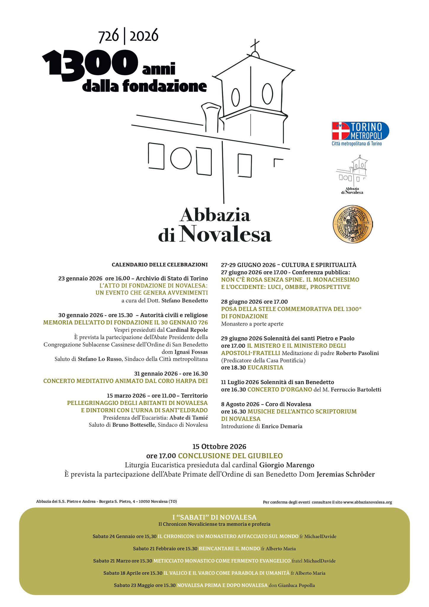 Parmi les initiatives spéciales du Jubilé figure le cycle « Les Samedis de Novalesa », consacré cette année à « La Chronique de Novalesa : entre mémoire et prophétie » :