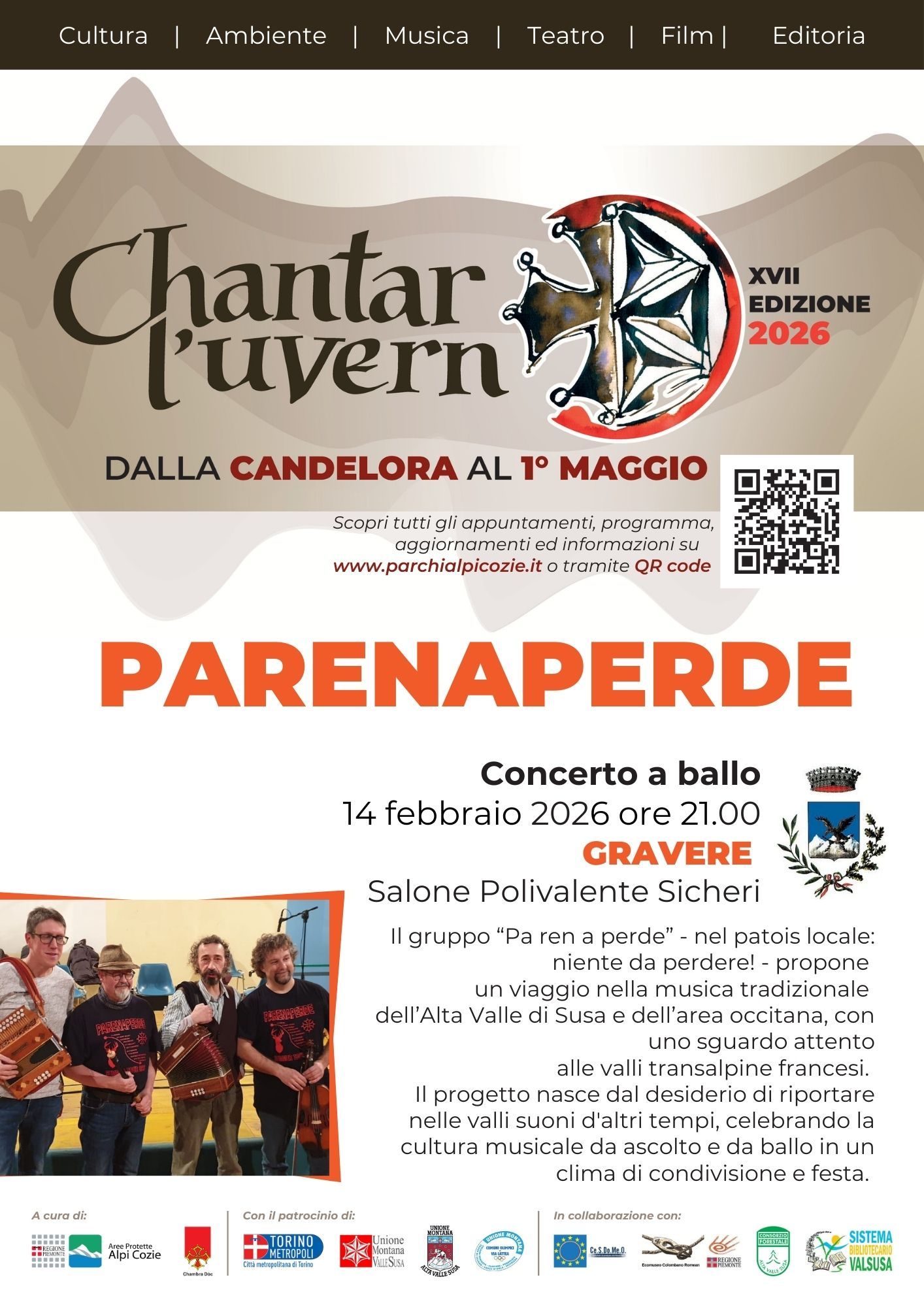 Parenaperde interprète de la musique traditionnelle de la Haute Vallée de la Dora : L'enthousiasme de jouer en direct de la musique folklorique alpine traditionnelle, partagé avec un groupe d'amis danseurs, a donné naissance à ce projet, faisant revivre les sonorités d'antan dans nos vallées. Le répertoire musical met à l'honneur la musique et la danse de la Haute Vallée de la Suse et de toute la région occitane, avec une attention particulière portée aux vallées transalpines françaises, si riches en culture musicale et dansante traditionnelle.