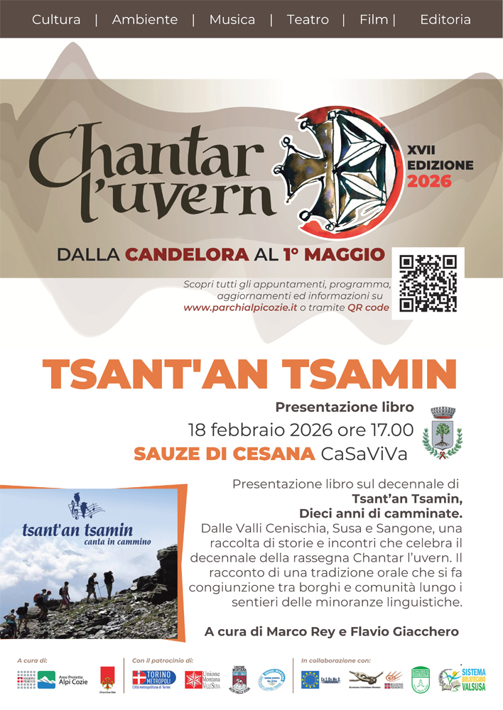 Le mercredi 18 février à 17h, à CaSaViVa (Via Principale 9, Sauze di Cesana, Tsant'an Tsamin), aura lieu la présentation du livre célébrant dix années de marche dans la vallée de Suse, sous la direction de Marco Rey et Flavio Giacchero.