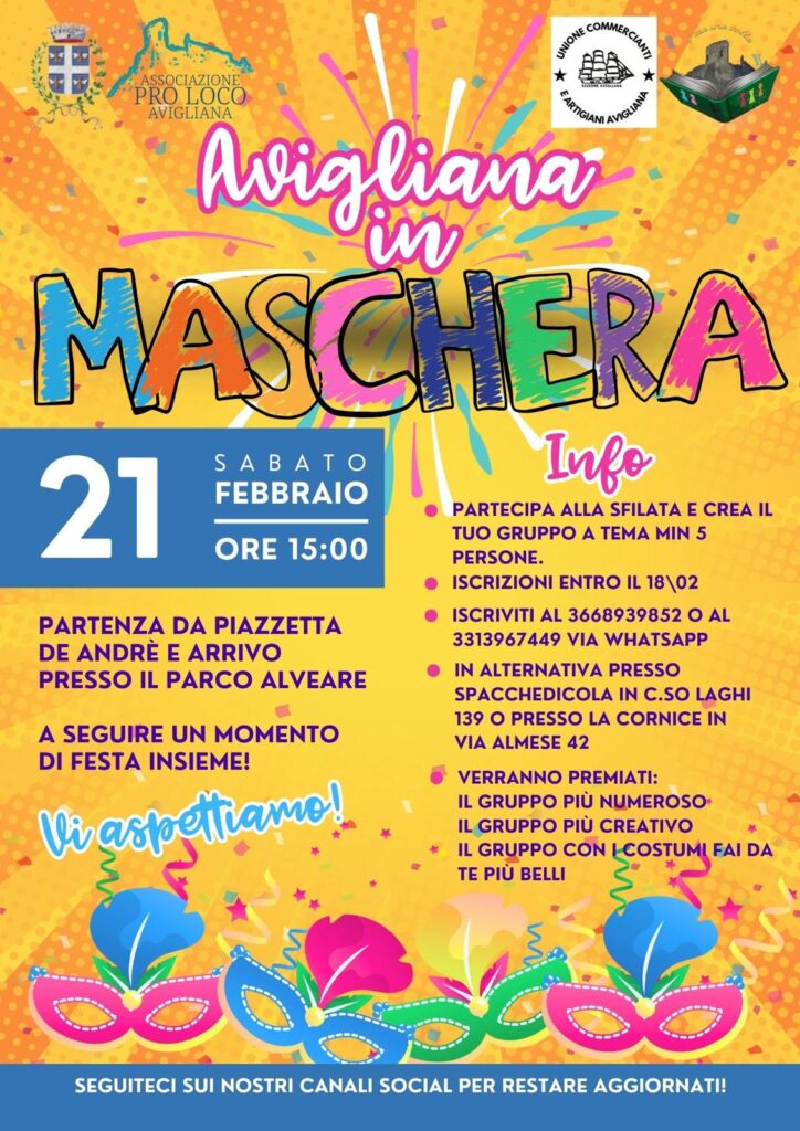 Le carnaval arrive à Avigliana avec un défilé masqué le samedi 21 février, à partir de 15h, de la Piazzetta De André au parc Alveare Verde. Le festival est organisé par Pro Loco, l'Unione Commercianti e Artigiani et l'association C'era una volta, avec le soutien de la municipalité d'Avigliana.