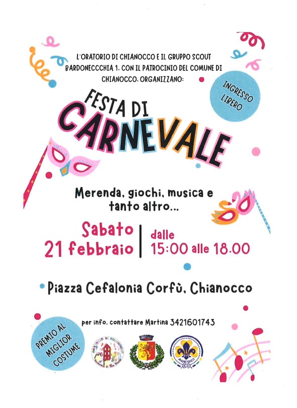 Fête de carnaval dans l'entrepôt de la Piazza Martiri di Cefalonia e Corfù de 15h00 à 18h00.