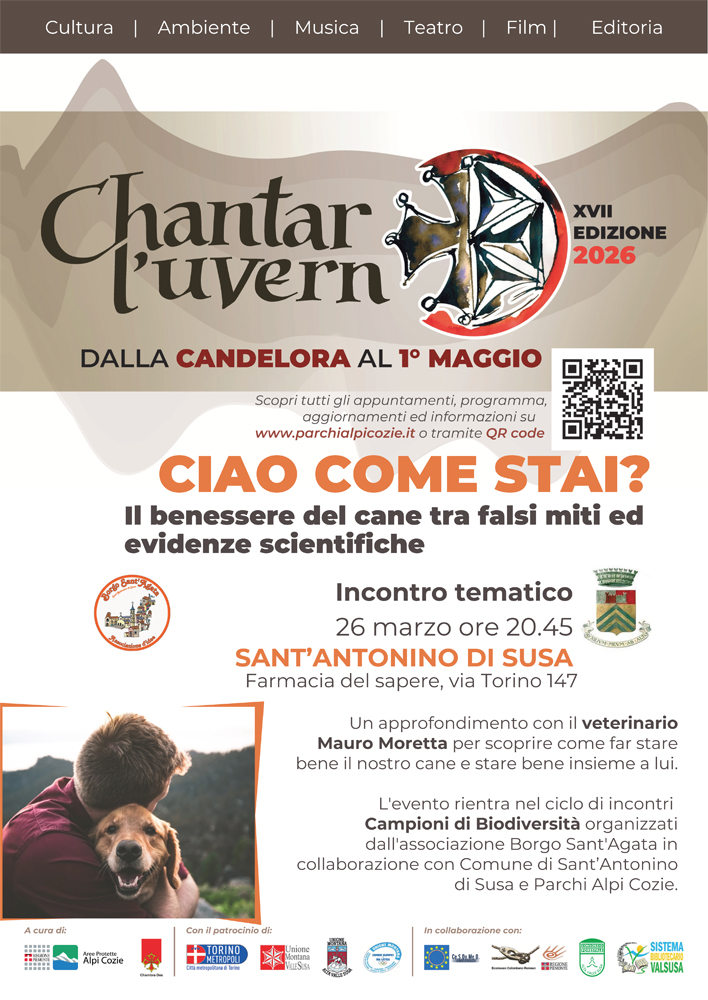 Jeudi 26 mars à 20h45 à Sant'Antonino di Susa, à la Farmacia del Sapere (Via Torino 147), une rencontre thématique « Bonjour, comment allez-vous ? Bien-être du chien : faux mythes et preuves scientifiques » avec le vétérinaire Mauro Moretta.