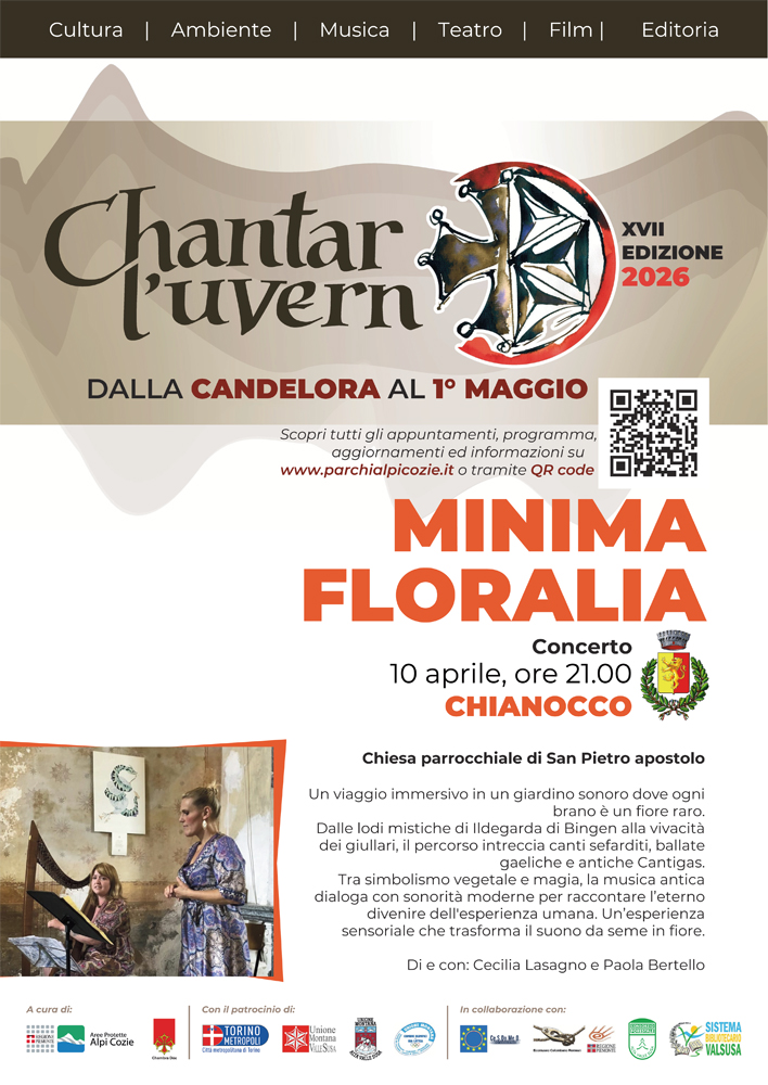 Le vendredi 10 avril à 21h à Chianocco, en l'église paroissiale San Pietro Apostolo, aura lieu le concert pédagogique « Minima Floralia », conçu et interprété par Cecilia Lasagno et Paola Bertello.