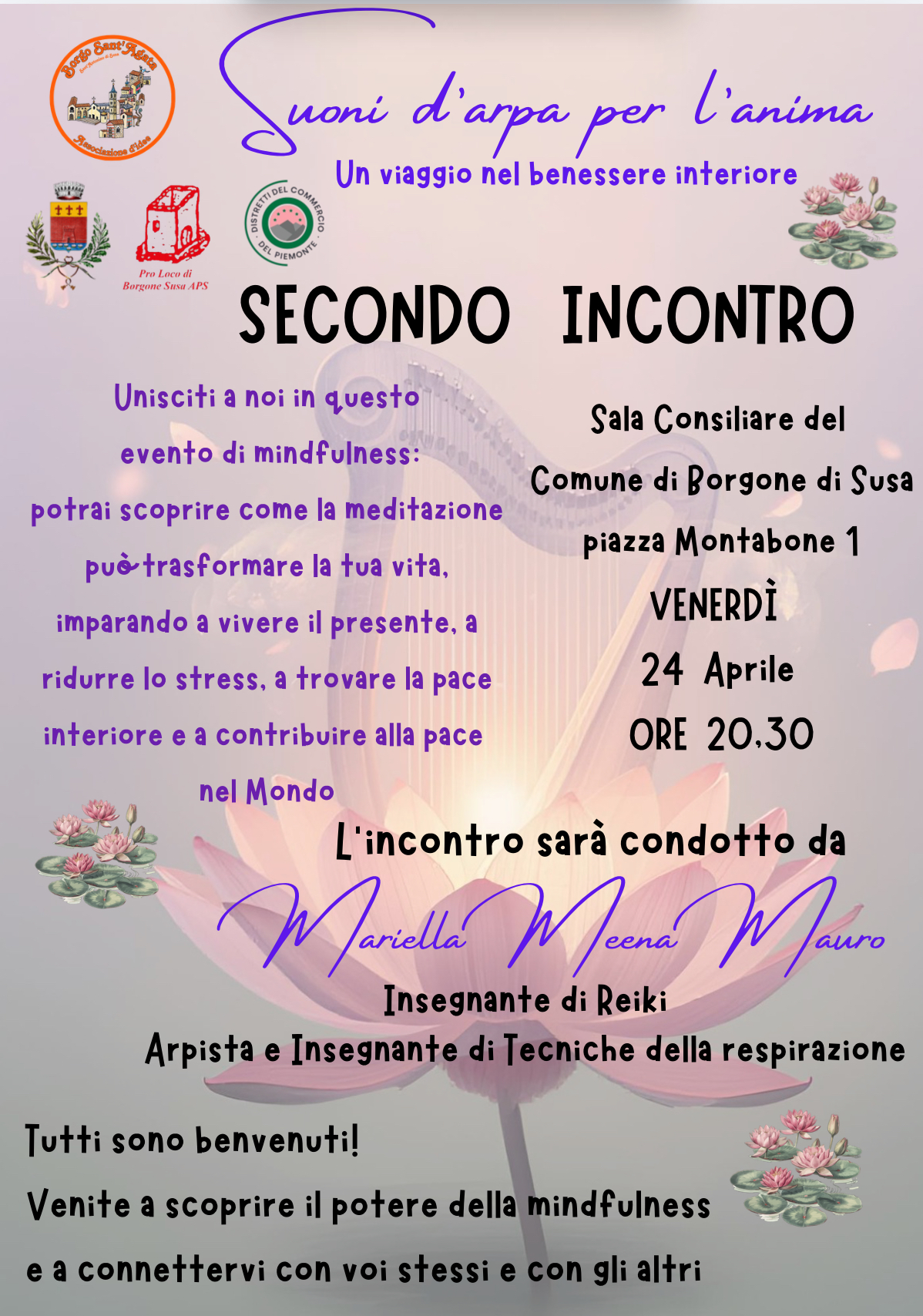 Le vendredi 24 avril à 20h30, dans la salle du conseil municipal de Borgone Susa, aura lieu le deuxième événement de la série « Harp Sounds for the Soul », un voyage vers le bien-être intérieur par la pleine conscience, animé par Mariella Meena Mauro.