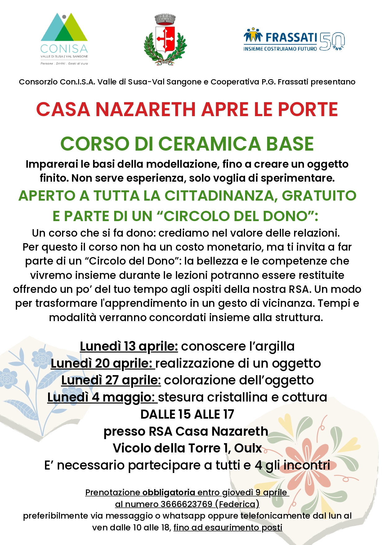 Ce cours d'initiation à la céramique, gratuit et ouvert à tous, s'inscrit dans une démarche solidaire. En contrepartie, vous pouvez donner de votre temps aux résidents de la maison de retraite Casa Nazareth (Vicolo della Torre 1).