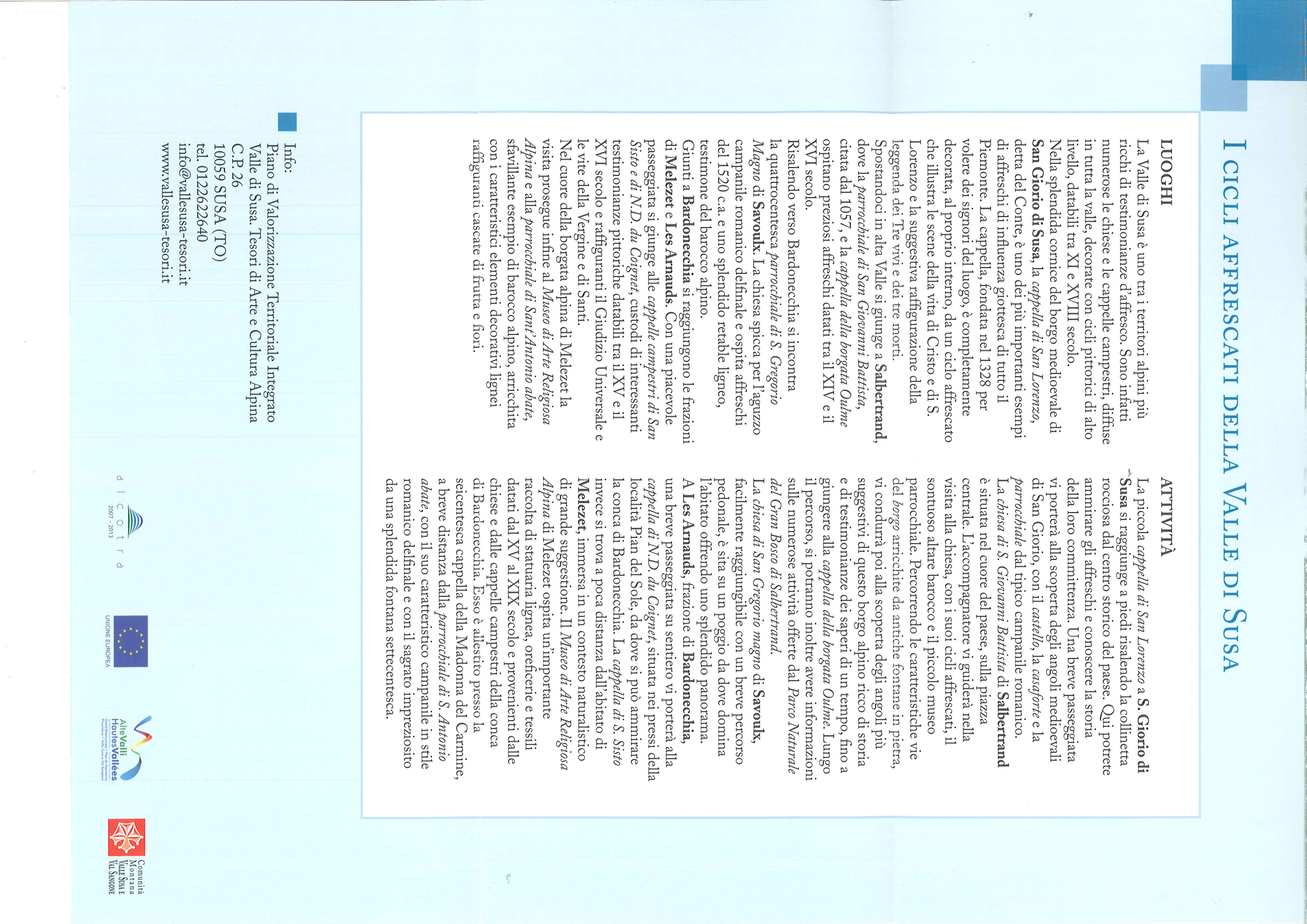 Cet itinéraire permet de découvrir, tout au long de la vallée, de nombreuses églises et chapelles rurales, décorées de cycles picturaux de haut niveau, datant entre le XIe et le XVIIIe siècle, de la Chapelle du Comte de San Giorio aux cycles de fresques du XVIe siècle de Salbertrand (Église paroissiale, Chapelle de l'Annonciation de l'Oulme et Hôtel Dieu) jusqu'à Bardonecchia, avec les chapelles rurales de Les Arnauds, Melezet, Horres, Chaffaux, l'église et les piliers votifs de Rochemolles.