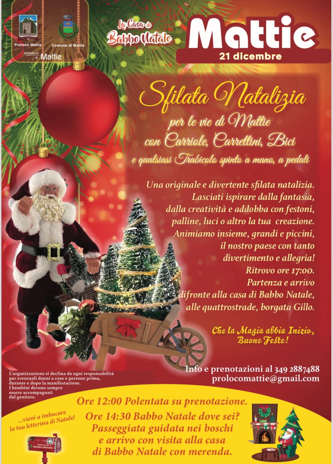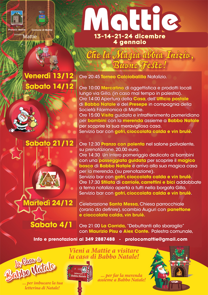 Per festeggiare l’arrivo del Natale la Proloco di Mattie organizza per sabato 21 dicembre una giornata da trascorrere in compagnia con tante iniziative e divertimento per grandi e piccini!