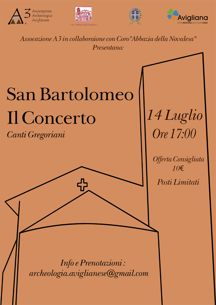 Nuovo evento nella chiesa - priorato di San Bartolomeo al Lago Piccolo di Avigliana, organizzato dall’Associazione Archeologica Aviglianese – A3, con il patrocinio della Città di Avigliana: domenica 14 luglio la prima edizione di “San Bartolomeo – Il Concerto” con la partecipazione de il coro “Abbazia della Novalesa”.