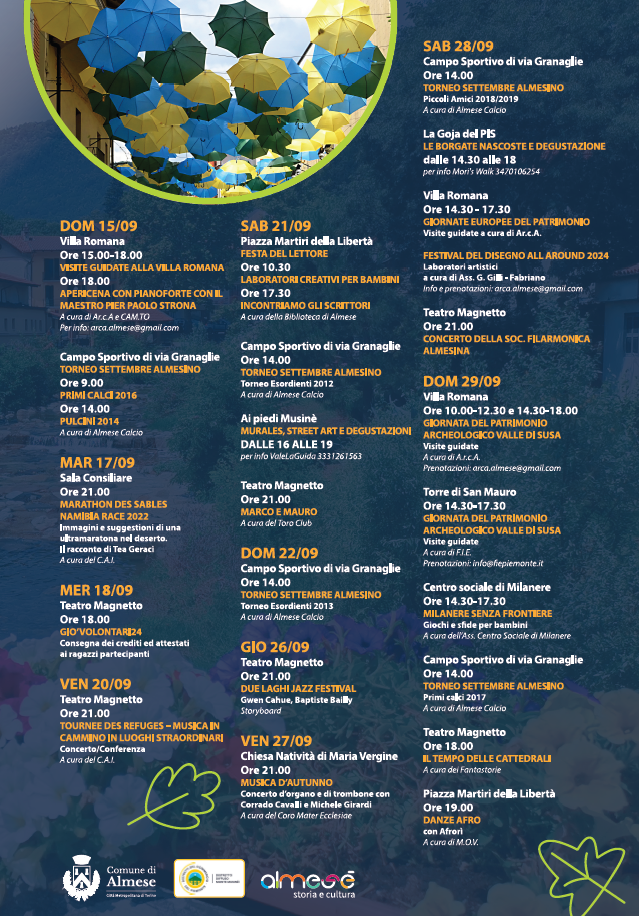 Anche quest'anno il Comune di Almese si prepara a salutare la stagione estiva e ad accogliere quella autunnale, proponendo una nuova edizione del "Settembre Almesino". La manifestazione, organizzata come ogni anno in occasione della festività della Santa Patrona di Almese (Natività di Maria Vergine - 8 settembre) con la partecipazione di numerose associazioni locali, offrirà momenti di cultura, sport, musica e divertimento, coinvolgendo cittadine e cittadini di tutte le età.